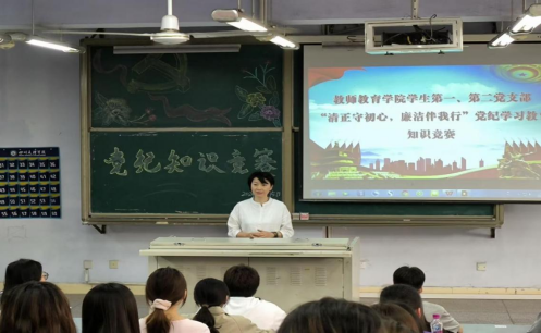 为深入学习贯彻《中国共产党纪律处分条例》,教育引导广大党员同志自觉主动学纪、知纪、明纪、守纪,全面落实从严治党要求,努力把纪律规矩转化为政治自觉、思想自觉、行动自觉,2024年6月5日,taptap点点体育学生第一、第二党支部在博文楼215教室开展“清正守初心、廉洁伴我行”党纪学习教育知识竞赛活动。本次活动采取集中线上答题形式,学生第一、第二党支部全体党员参加。党委副书记王文娟主持本次活动。
