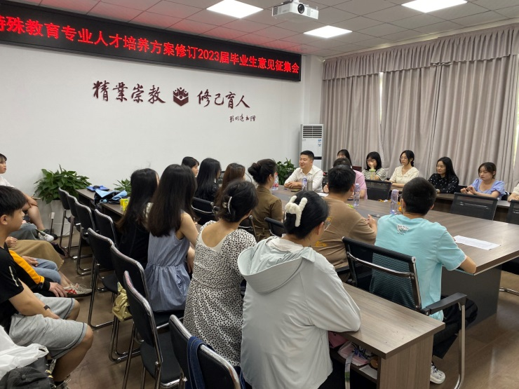 • 本科人才培养方案是实现人才培养目标的蓝图,是组织开展教育教学活动,推进专业内涵式发展的基本遵循,为深入了解特殊教育专业本科人才培养方案实施状况与存在问题,精准掌握学生专业学习与发展需求,2023年6月13日,特殊教育教研室在学院会议室开展人才培养方案修订2023届毕业生意见征集教研活动。本次教研活动由靳少举老师主持,特殊教育专业全体教师和2023届毕业生参加。