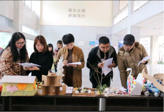 本次比赛以“环保”为主题,共计45件作品入围决赛,同学们发挥自己的创造性思维和想象力,利用废旧纸箱、塑料壳、枯枝落叶等物品制成手工作品。一件件精美的手工作品经评委老师们现场深入探讨、细致评审,最终评定曾妤婕等5名同学作品获得一等奖,刁建强等7名同学作品获得二等奖,邱雨欣等10名同学作品获得三等奖。